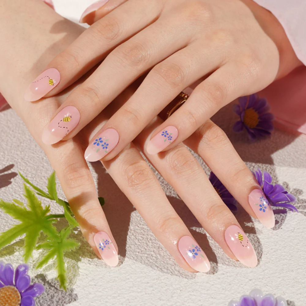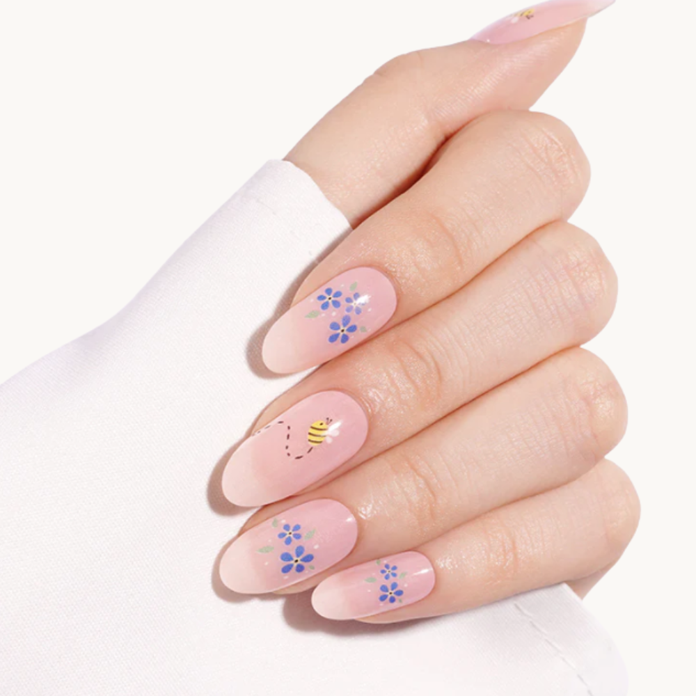 Un nude uni et fines fleurs bleues/jaunes et une petite abeille. Cet autocollant ongle en gel uv champêtre assure une manucure gel raffinée. Une bande gel uv florale pour un ongle en gel délicat.
