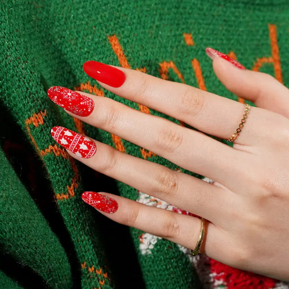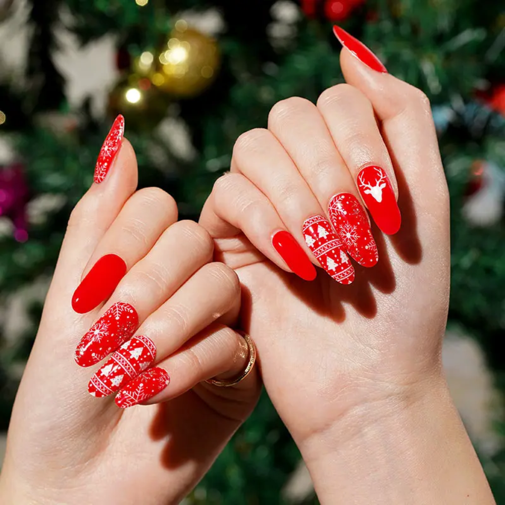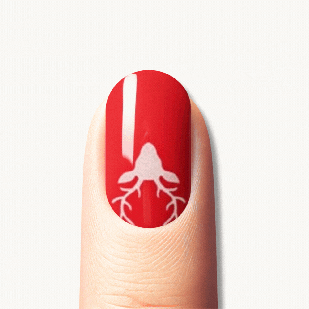 Felice revisite le rouge iconique avec une touche hivernale tout en finesse. Le modèle affiche un rouge brillant intense, profond et lumineux, sur lequel ressort un délicat motif blanc givré représentant une silhouette de renne stylisée, installée au centre de l’ongle. Les bois subtils et les lignes douces apportent une allure chaleureuse et élégante.