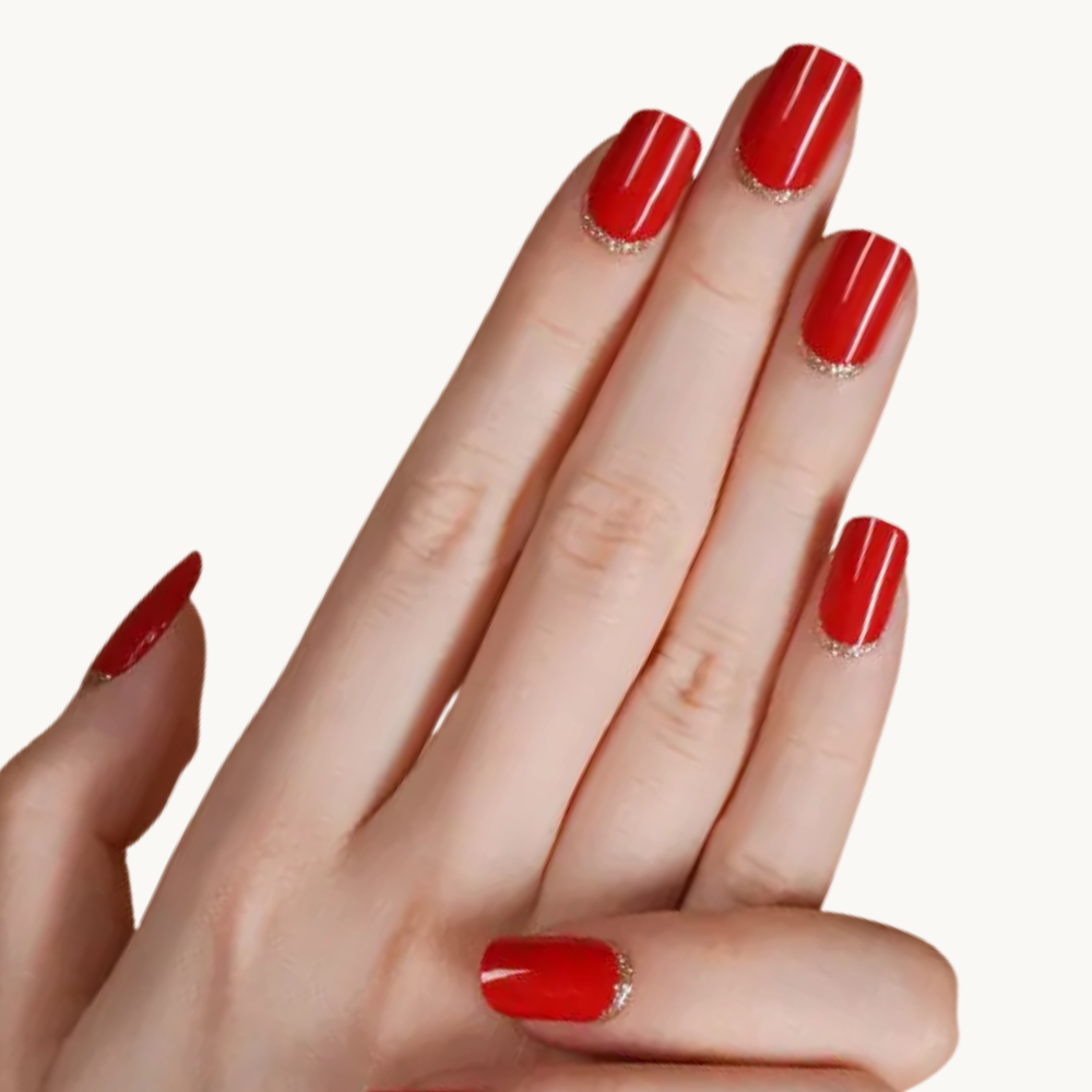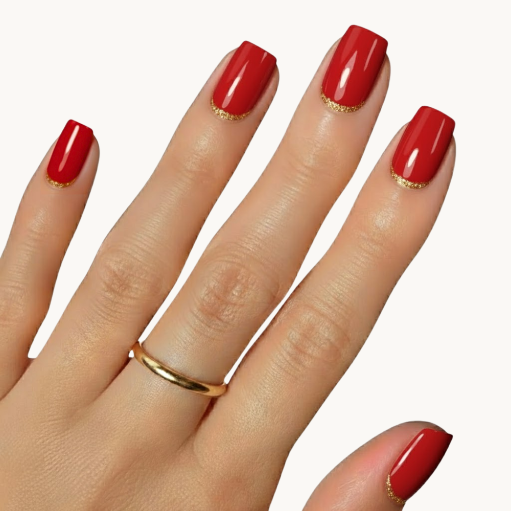 Mariah sublime vos mains avec un rouge profond habillé d’un délicat contour pailleté doré. À la fois sophistiqué et festif, ce modèle incarne le glamour intemporel avec une touche de luxe discret. Idéal pour les soirées élégantes ou pour ajouter un éclat raffiné à vos looks du quotidien, est le cc'hoix parfait pour celles qui recherchent une manucure à la fois audacieuse, féminine et résolument élégante.