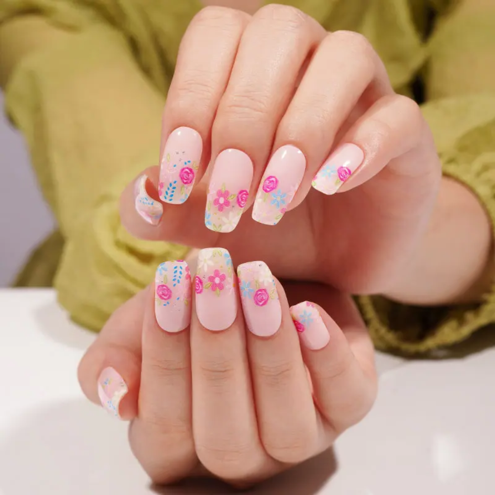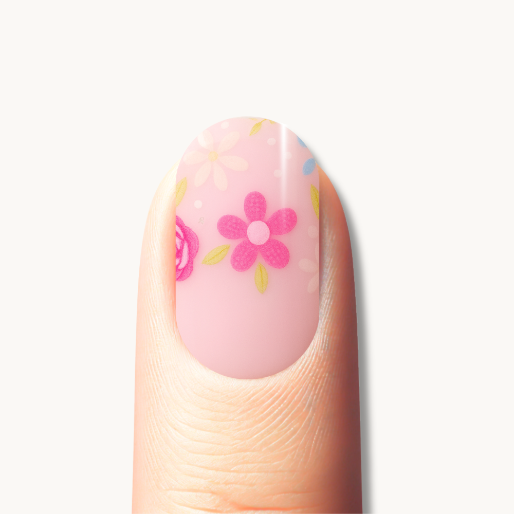 Rosalie est une célébration de la douceur et de la fraîcheur printanière. Son fond rose pastel est parsemé de petites fleurs délicates dans des tons vifs et tendres, évoquant un champ fleuri au lever du soleil. Ce design romantique et joyeux habille vos ongles d'une touche poétique et féminine. Parfait pour apporter de la gaieté à votre quotidien ou sublimer une tenue légère et colorée.