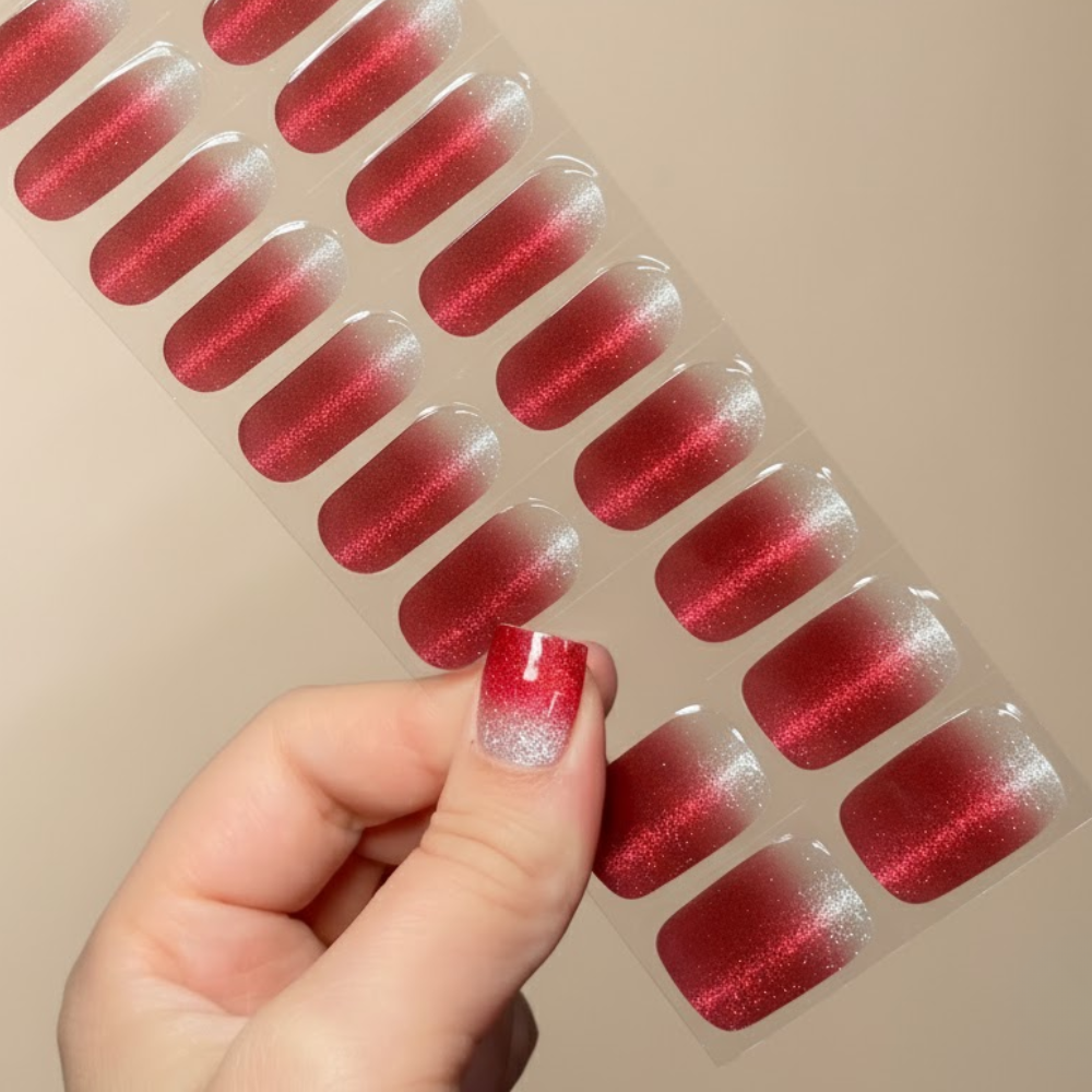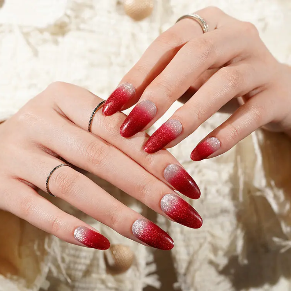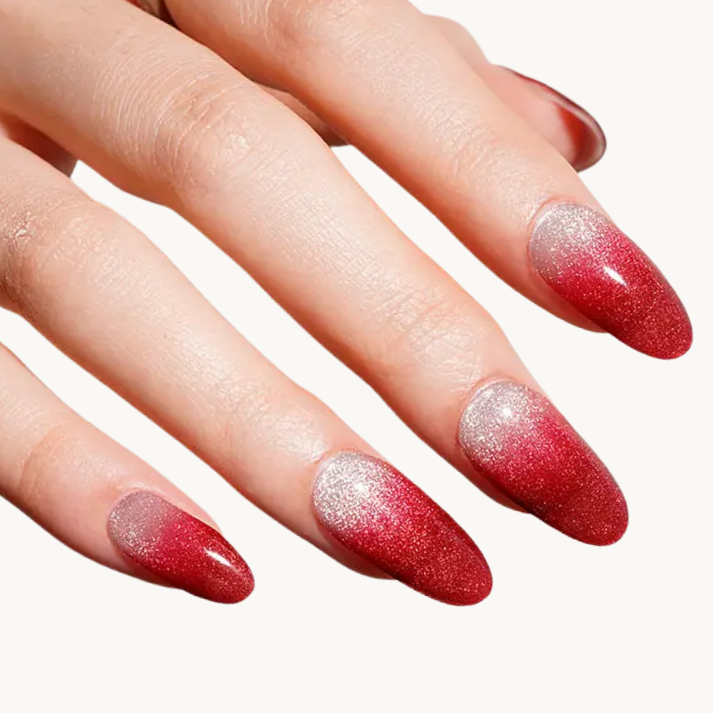 Carmen ose le rouge passion dans un dégradé envoûtant, réchauffé par une pointe d’éclat argenté. Vibrant, sensuel et affirmé, ce modèle incarne la féminité confiante. Parfait pour celles qui aiment les manucures audacieuses et pleines de caractère.