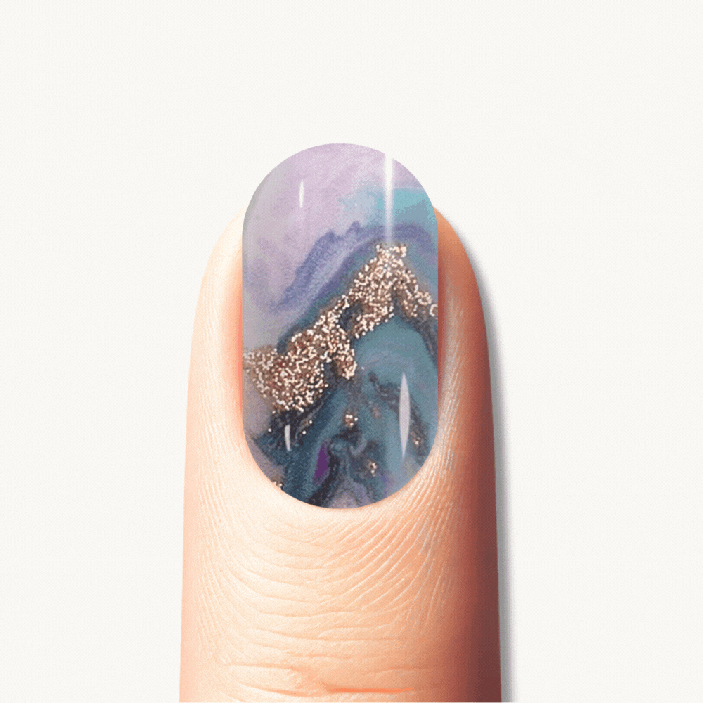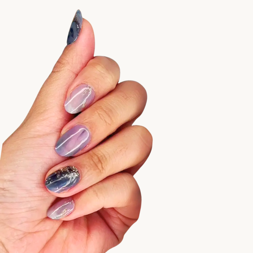 Lazura évoque la profondeur des océans et la beauté brute des minéraux. Ses nuances marbrées de bleu, violet et gris sont magnifiées par des éclats dorés texturés qui rappellent les veines d’une pierre précieuse. Une manucure sophistiquée et envoûtante pour celles qui aiment allier mystère et élégance.