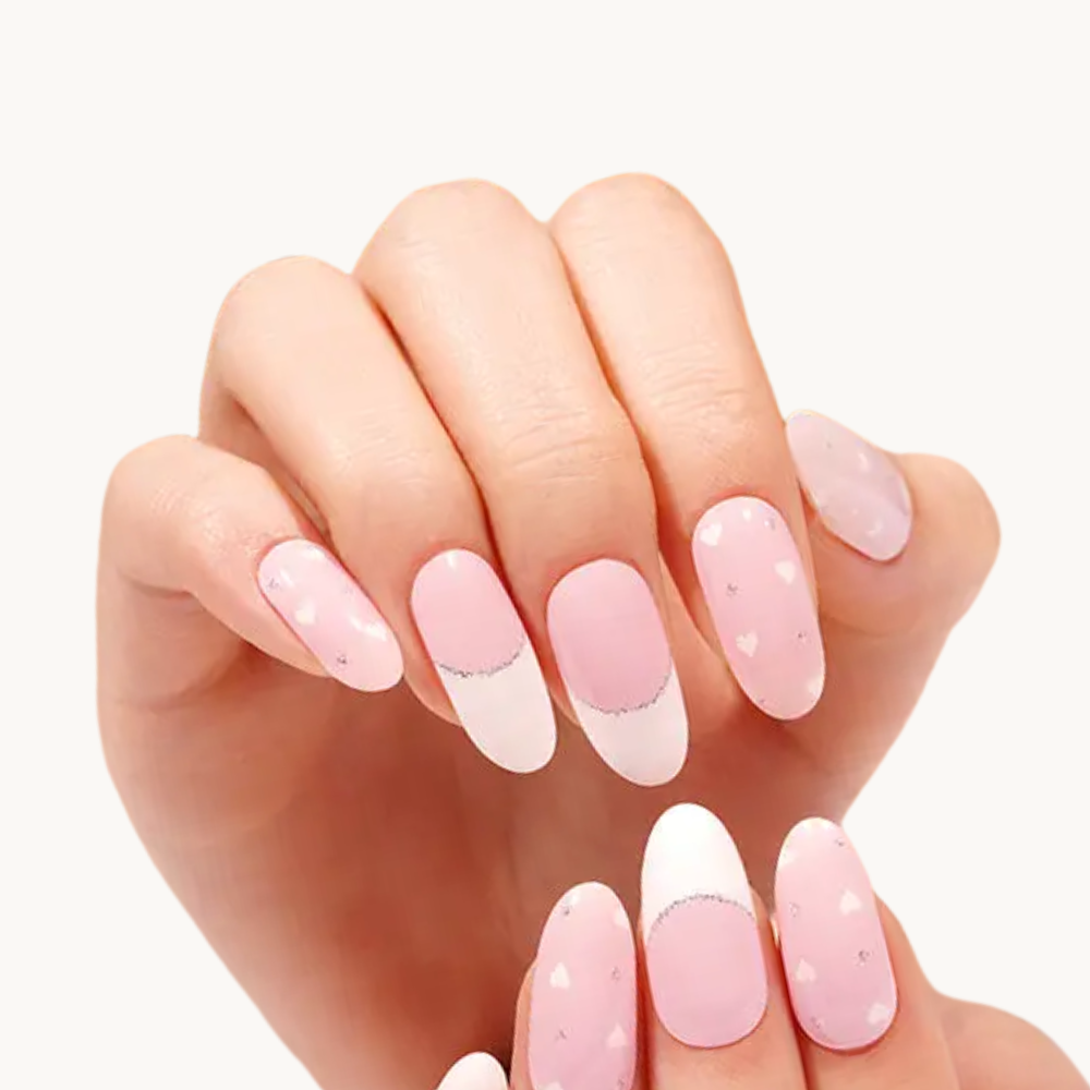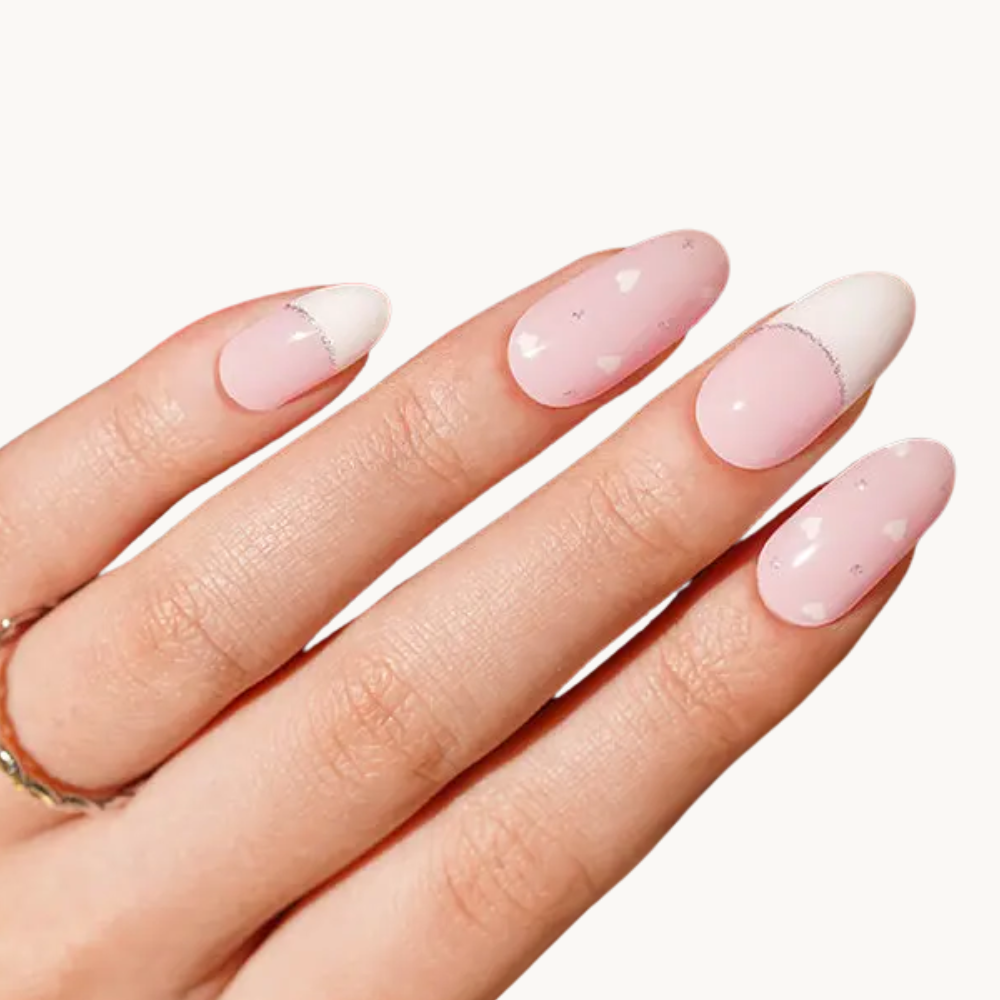 Betty incarne la douceur et la féminité avec ses nuances de rose pâle délicatement ponctuées de petits cœurs blancs et des strasses ainsi que d'un modèle french entouré d'un cercle pailleté d'argent. Inspiré par une esthétique douce et minimaliste, ce design est parfait pour celles qui recherchent un look discret mais élégant. Betty s'adapte aussi bien à une tenue quotidienne qu'à un événement spécial, apportant une touche de charme intemporel à vos ongles.
