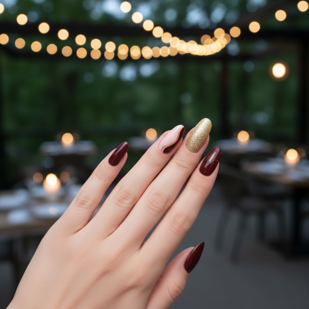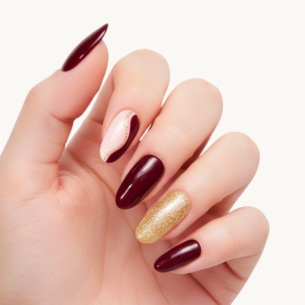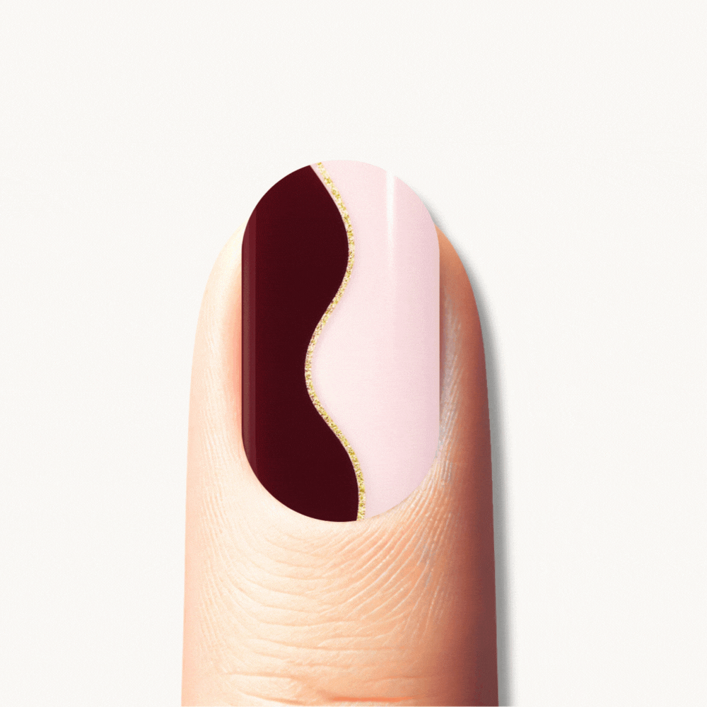 Olivia allie élégance et audace dans un design fluide et raffiné. Son duo de teintes — un bordeaux profond et un rose poudré — est sublimé par une délicate ligne dorée qui ondule avec grâce. Ce contraste chic et harmonieux évoque la féminité moderne : douce mais affirmée. Idéale pour une soirée élégante, un dîner romantique ou un look sophistiqué du quotidien, la manucure Olivia attire les regards sans jamais en faire trop.