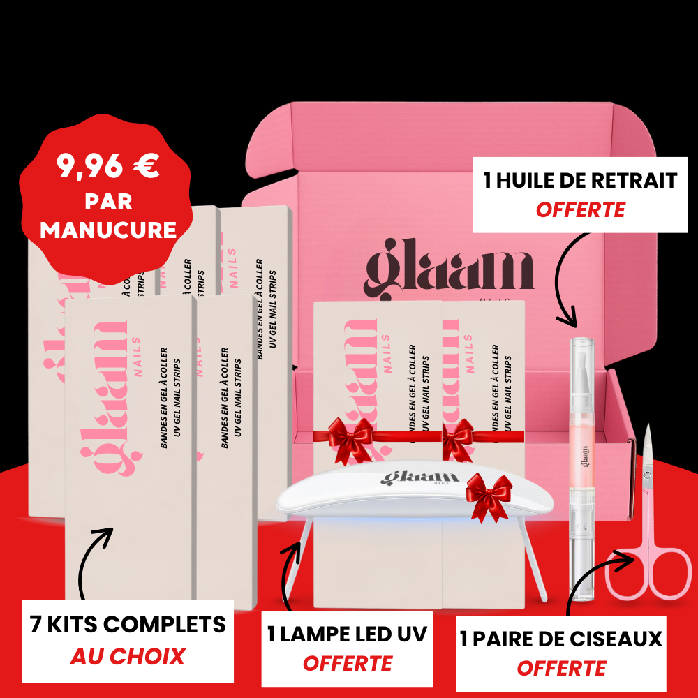 Le Pack Prestige inclut 7 Kits Glaam Nails, 1 huile de retrait, 1 paire de ciseaux et 1 lampe UV offerte. Offrez-vous jusqu'à 7 mois de manucure impeccable à moindre coût !