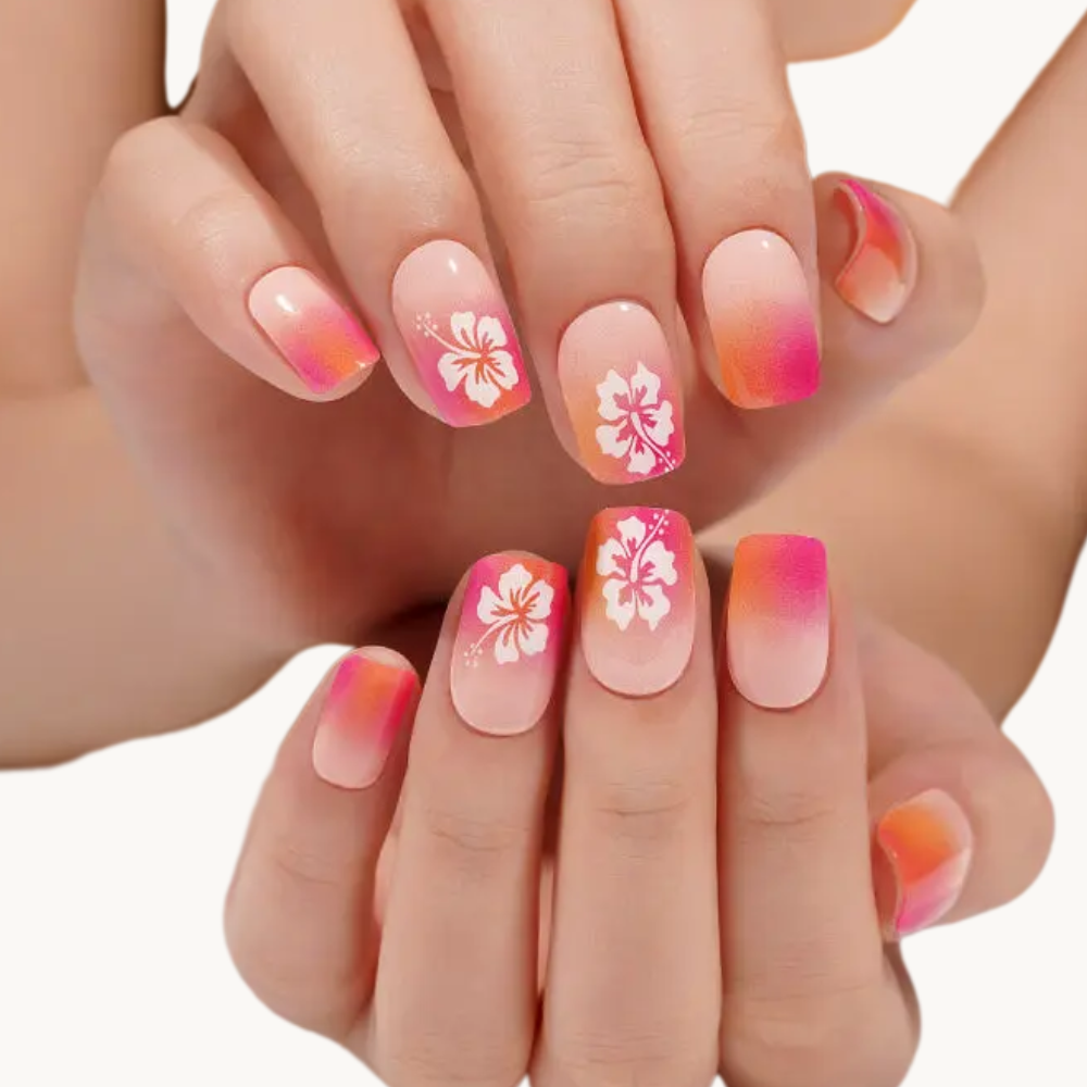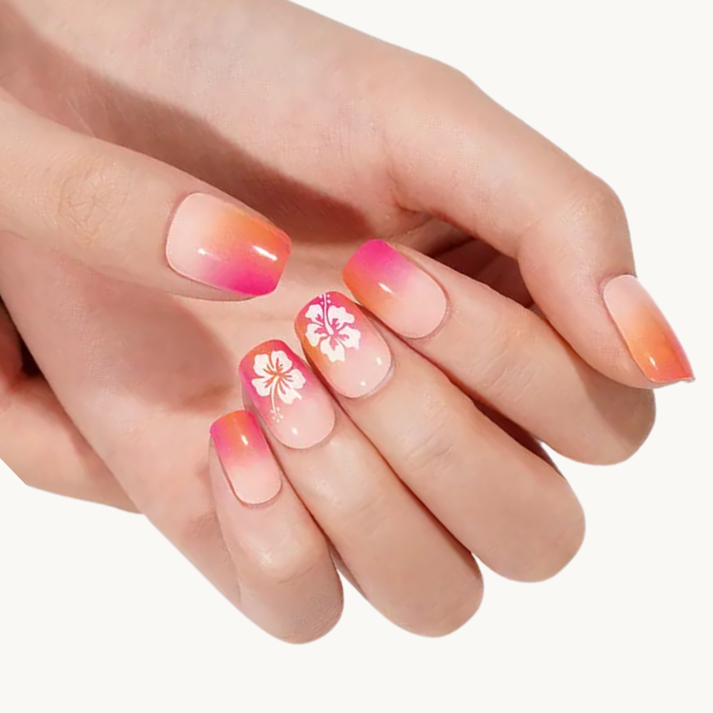 Apportez une touche tropicale à votre manucure avec cette bande de gel au dégradé doux rose, pêche et orange. Les motifs de fleurs d’hibiscus blanches ajoutent une note exotique et élégante, parfaite pour l’été ou vos vacances au soleil. Un design frais et coloré qui sublime vos ongles en toute légèreté.
