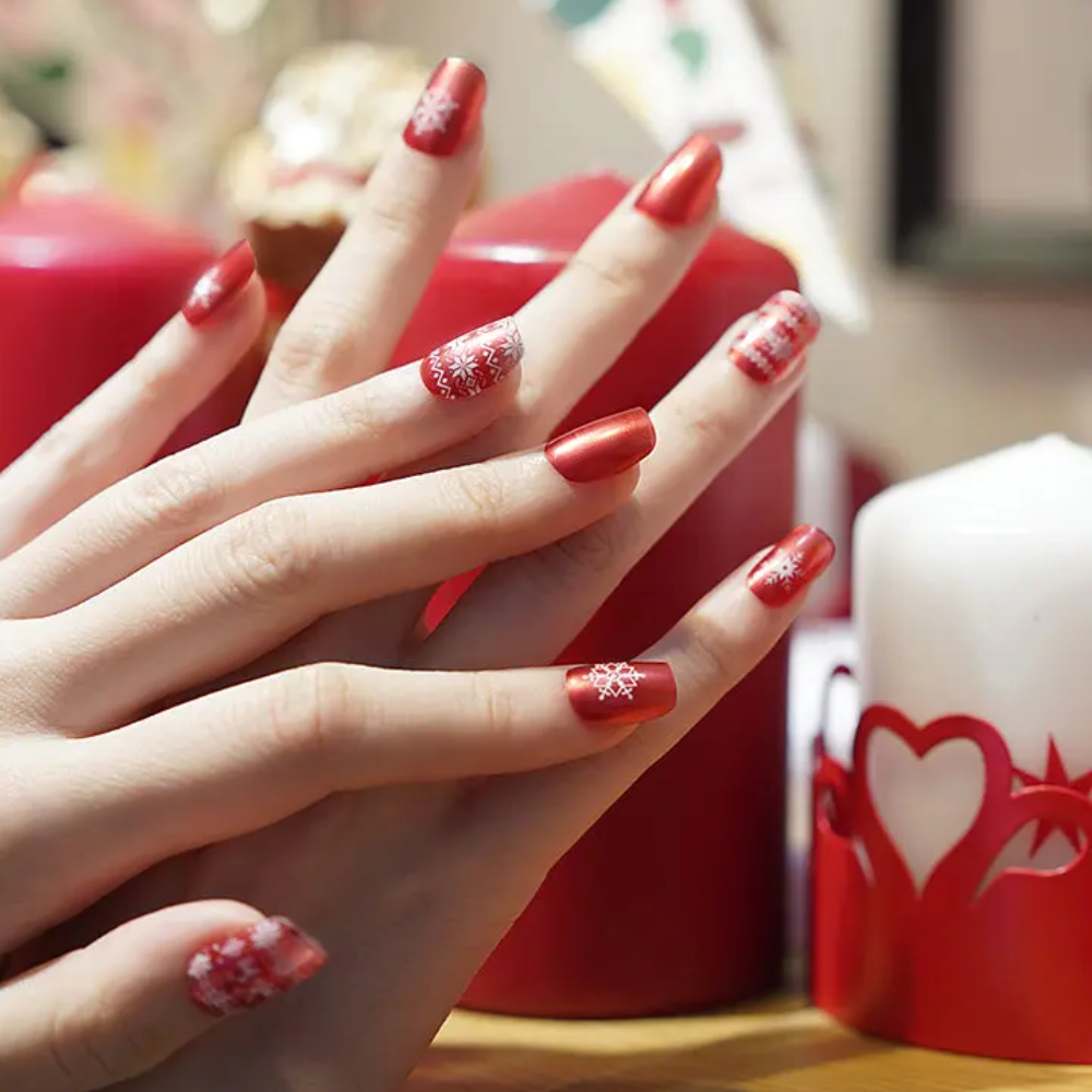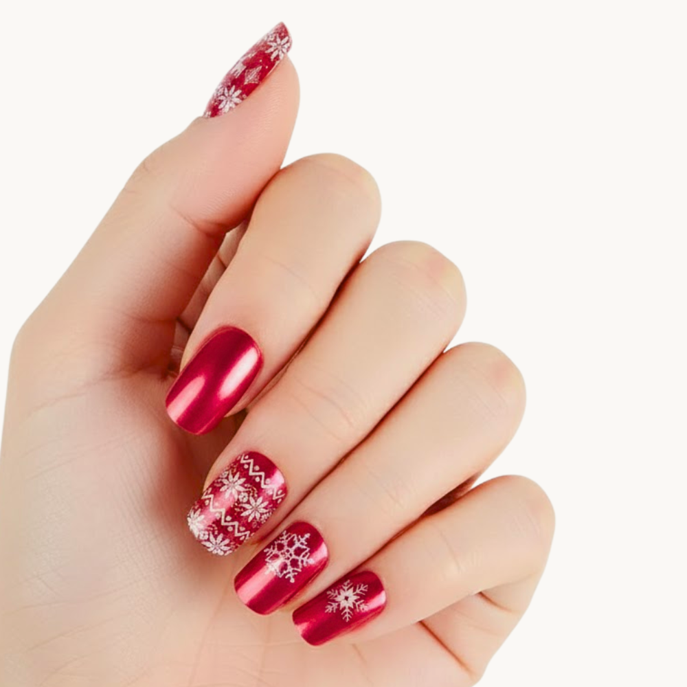 La couleur Rudy est un rouge festif et vibrant, ornée de motifs nordiques évoquant la magie des fêtes de fin d'année. Ce modèle enchanteur transforme tes ongles en un véritable accessoire de saison, parfait pour compléter une ambiance chaleureuse et joyeuse. L'association du rouge éclatant et des détails délicats crée un look unique, à la fois audacieux et élégant, idéal pour célébrer avec style.