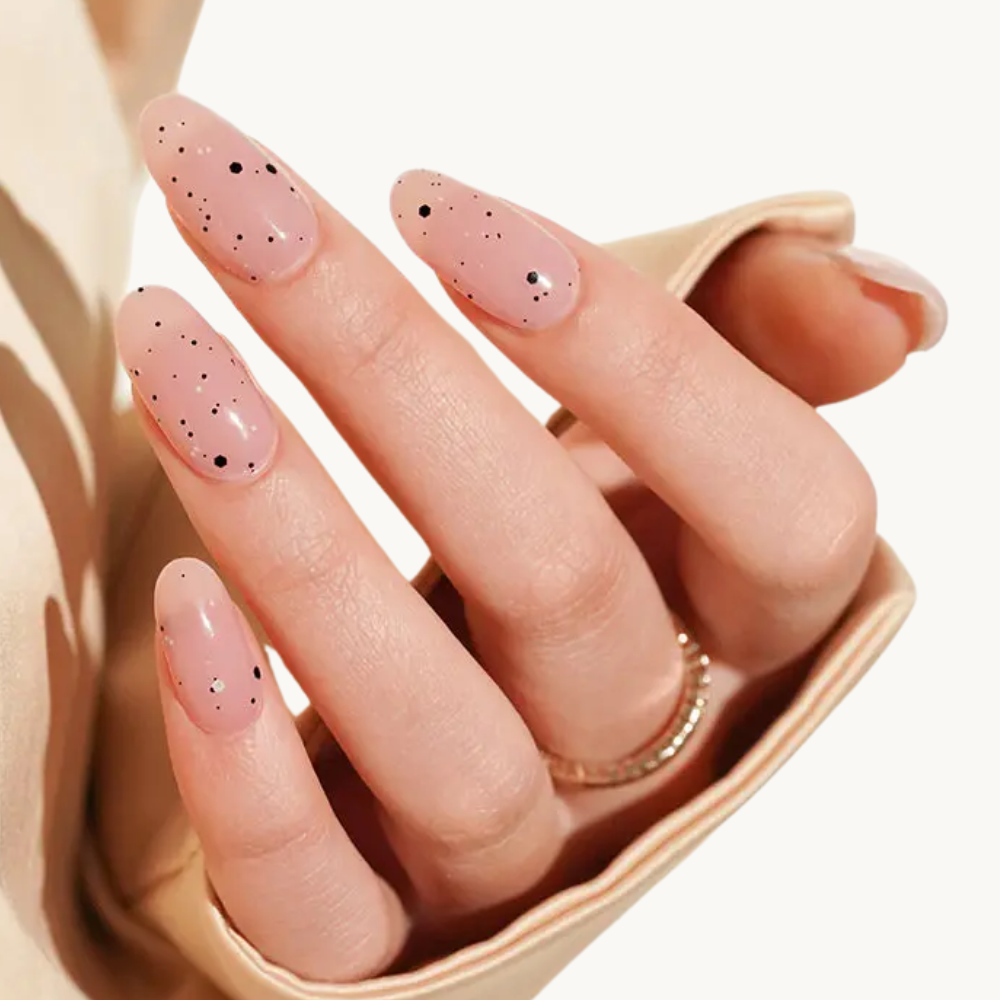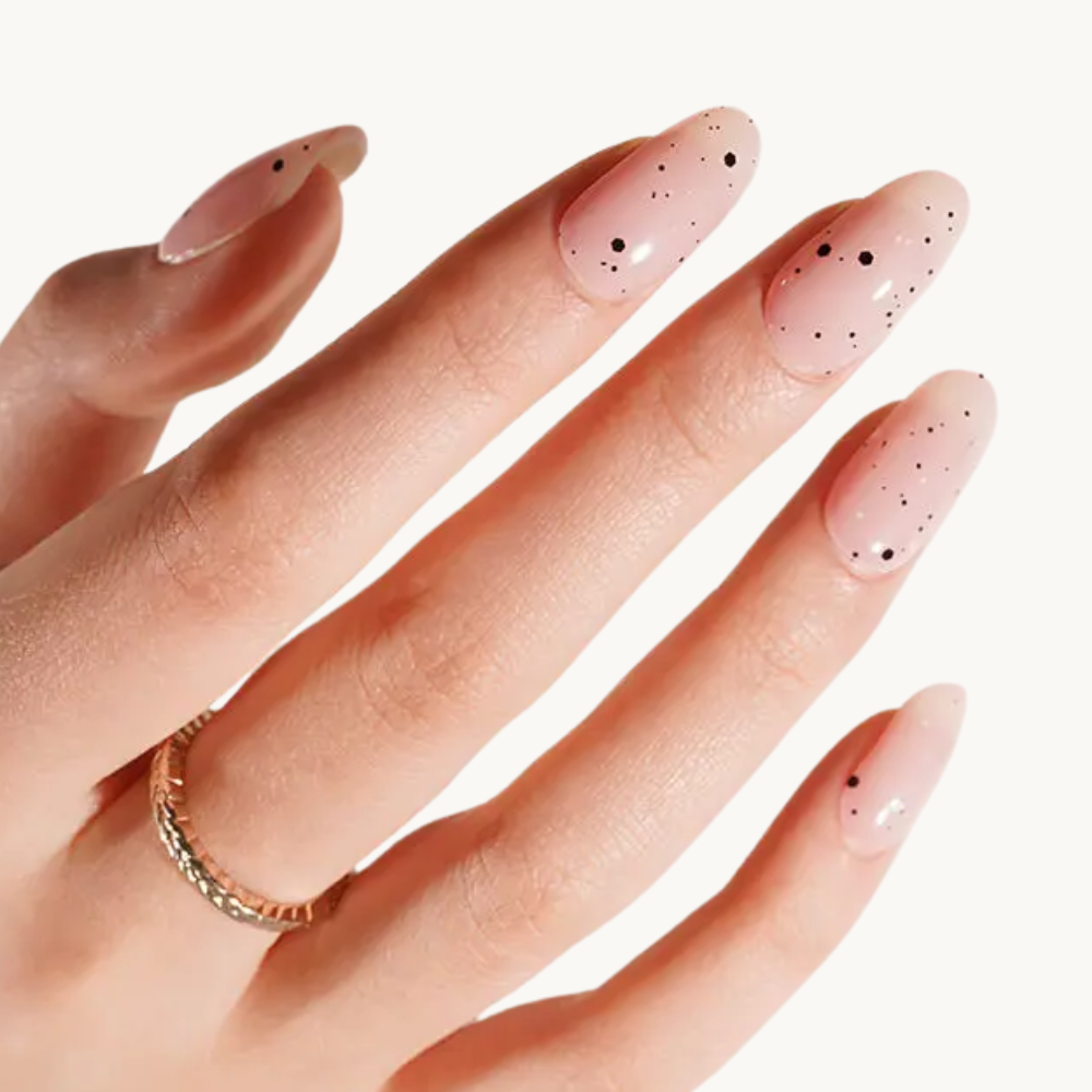 Tara célèbre la simplicité moderne avec une touche artistique. Son fond rose nude délicat, parsemé de petites éclaboussures noires, évoque l'élégance du design minimaliste combiné à une esthétique abstraite. Chaque détail donne un effet unique, rappelant des toiles contemporaines ou des motifs inspirés de la céramique artisanale.